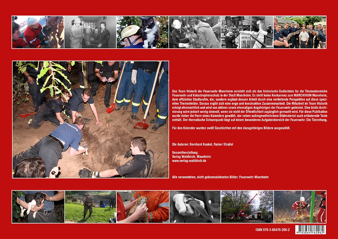 Bernhard Kunkel, Rainer Straßel Das Team Historik der Feuerwehr Mannheim versteht sich als das historische Gedächtnis für die Themenbereiche Feuerwehr und Katastrophenschutz in der Stadt Mannheim. Es stellt keine Konkurrenz zum MARCHIVUM Mannheim, dem offiziellen Stadtarchiv, dar, sondern ergänzt dessen Arbeit durch eine vertiefende Perspektive auf diese speziellen Themenfelder. Daraus ergibt sich eine enge und konstruktive Zusammenarbeit. Die Mitarbeit im Team Historik erfolgt ehrenamtlich und wird von aktiven sowie ehemaligen Angehörigen der Feuerwehr geleistet. Eine bloße Archivierung wäre jedoch wenig sinnvoll, wenn sie nicht der Öffentlichkeit zugänglich gemacht wird. Für diese Publikation wurde daher die Form eines Kalenders gewählt, der neben außergewöhnlichem Bildmaterial auch erläuternde Texte enthält. Der thematische Schwerpunkt liegt auf einem besonderen Aufgabenbereich der Feuerwehr: Die Tierrettung. DIN A3 Querformat, ISBN: 978-3-86476-206-2 Jahr: 2025 Preis: 20 Euro |